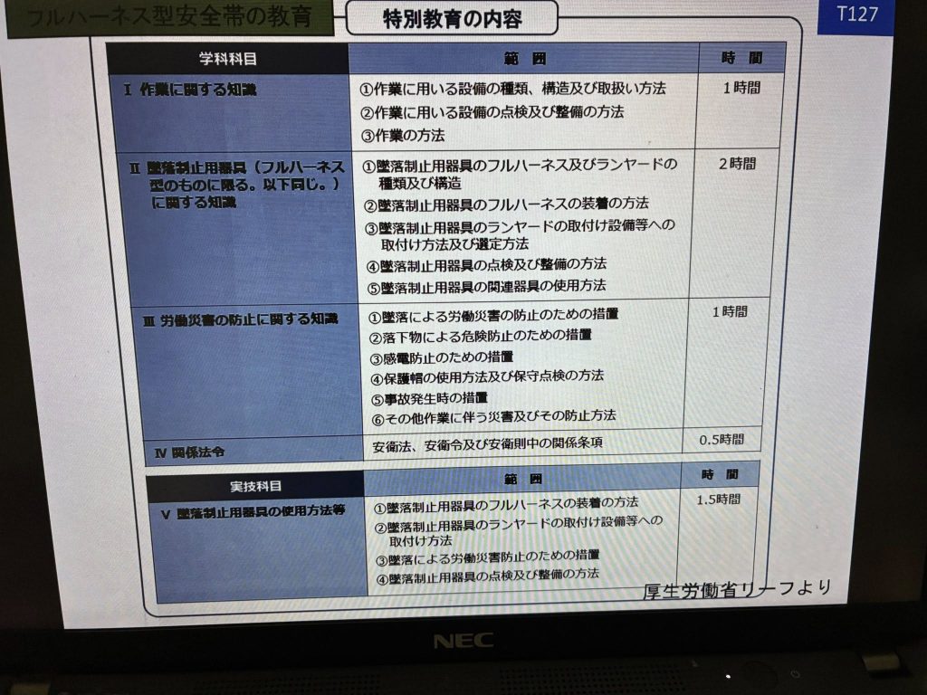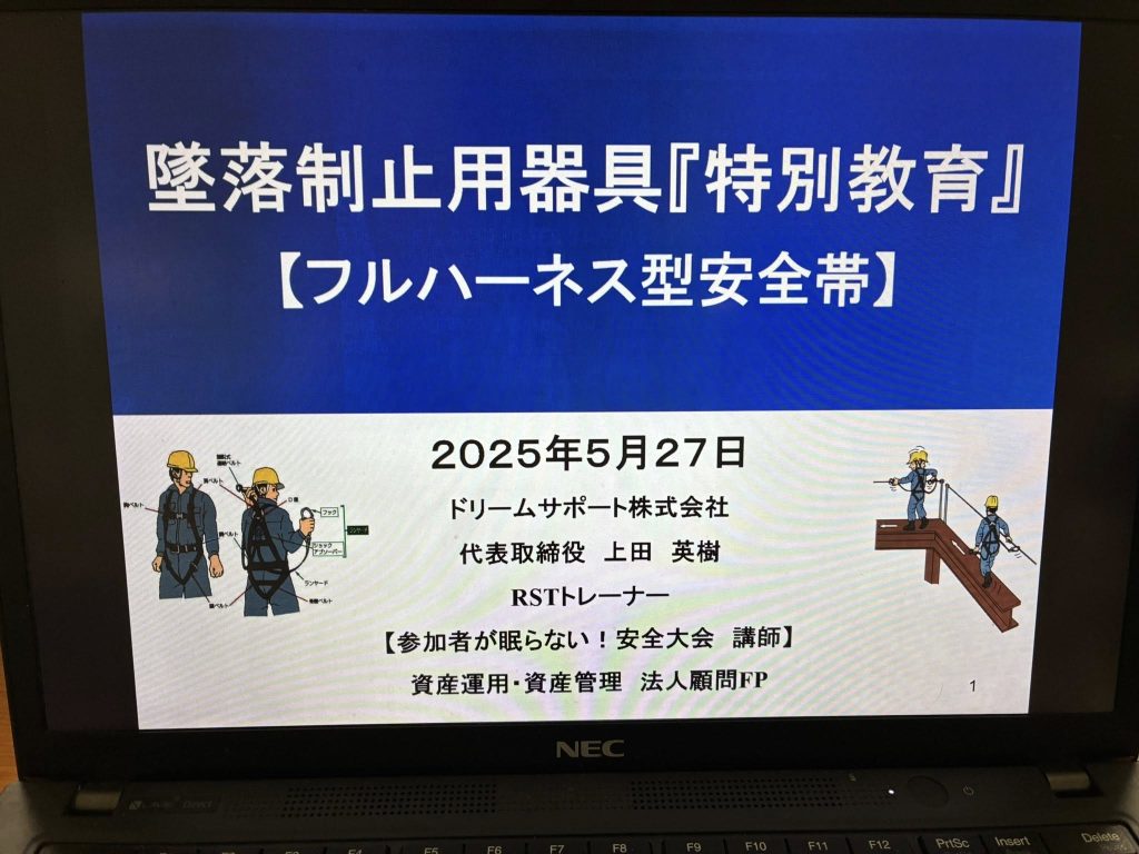 建設業・内装工事事業者様のご依頼でフルハーネス特別教育出張講師として1年ぶりにリピートで出動。